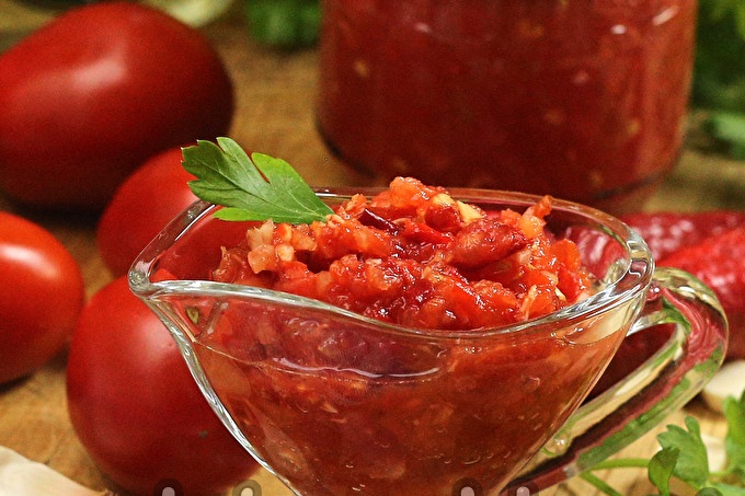 Adjika with horseradish and tomato garlic for the winter will turn out tastier and healthier if you cook it without cooking. The recipe is simple and affordable. Those who prefer a softer seasoning, which can be spread on bread or added to pizza, use spicy ingredients (hot pepper and garlic) in very small quantities.