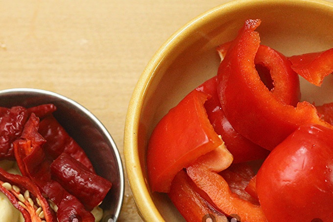 We clean the garlic cloves. We cut sweet and bitter peppers, clean the seeds, remove the stalk. We cut into pieces.