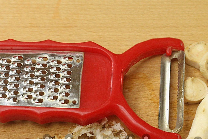 Peel the horseradish peel, cut into rounds. So that a strong pungent odor does not irritate the mucous membrane of the eye, and caustic juice in the skin of the hands, you need to clean the horseradish under a gentle stream of water, and then wash your hands with soap.