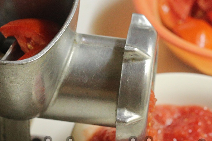 Scroll tomatoes through a meat grinder with large holes.