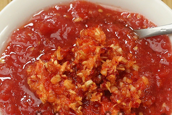 In a tomato, we cut off the place of attachment of the peduncle, cut the tomatoes in small pieces. All damaged places must be cut out so that adjika does not acidify during storage.