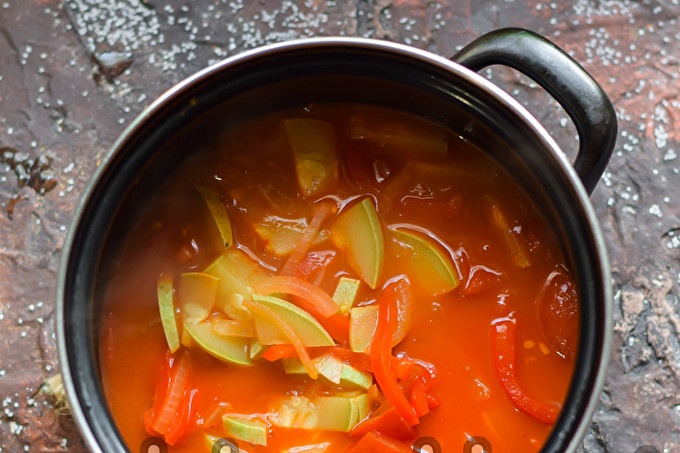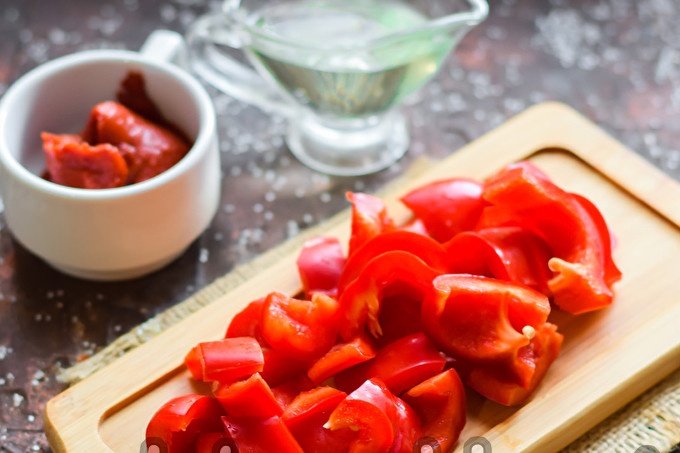 Put all the ingredients in a pan, add oil and add tomato paste, water. Pour salt and sugar, then send the container to the fire.