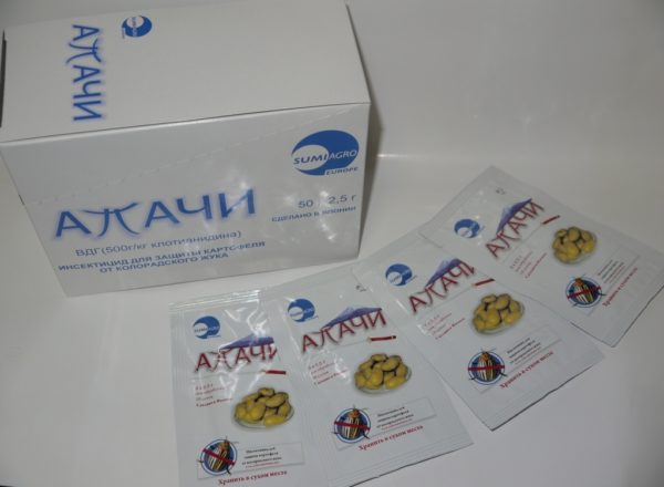 It is impossible to call a remedy for the Colorado potato beetle Apache absolutely safe for humans, and the instruction translated into Russian warns about this ambiguously. But, compared with previously available drugs, it is much more optimal to use. Neonicotinoid is contained in granules or powder in a proportion of 500 g per kg (in a 1: 2 ratio), carefully packed in a white foil bag and a cardboard box, which excludes its effect, when closed, even when stored at home.