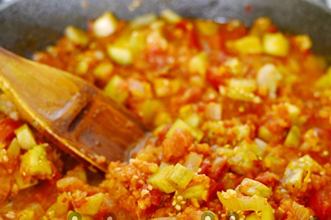We heat the sunflower oil in a large frying pan and fry the little blue ones, onions and garlic. Then we put hot pepper, one teaspoon of table salt, spices, and at the end tomatoes.