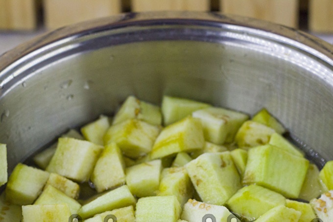 Wash and chop eggplant in large cubes. Fold in a deep bowl.