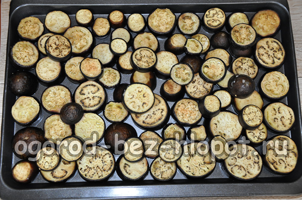 Grease a baking sheet with vegetable oil and put eggplant circles on it. Bake in the oven at a temperature of 200 ºС 30 - 35 minutes.