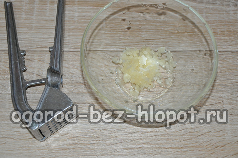 Peel the garlic and squeeze through the garlic.
