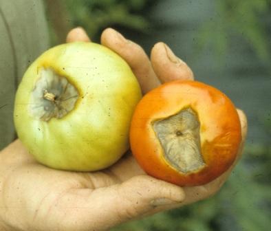 A stain appears at the base of the fruit, green tomatoes fall off.