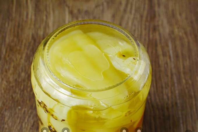 Now we put vegetables and fruits in clean and dry jars, alternating them. We fill the container to the very top, and then add brine. Roll up the banks.
