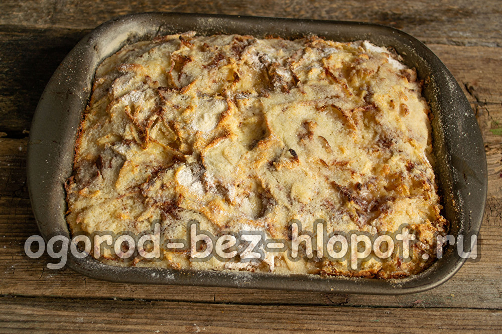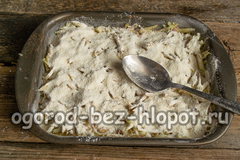 At this stage, sprinkle apples with a second portion of the dry mixture. Sprinkle evenly, gently shake, so that the mixture wakes up a little in the apple layer.