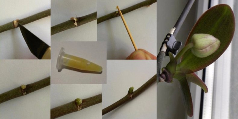 Before carrying out the processing procedure, it is necessary to prepare the tools and disinfect them. The place of application is better to choose the lower bud on the peduncle and remove the protective scale from it. With a clean thin needle, make a few shallow scratches on the kidney and apply a very small amount of the product. While shoots are forming, an orchid needs extra careful care with additional top dressing.