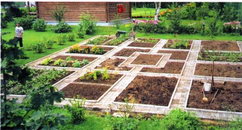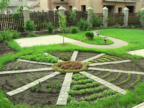 Very convenient and beautiful option on any site. To do this, you need to select several different sized plots with beds and plant various flowers and vegetables on them. Flowers are usually planted closer to the middle of the plot, and vegetables are closer to the edges. On the beds close to the middle of the plot, you can plant decorative Christmas trees, pines or just tall flowers, such as lilies or roses. The space between the beds is usually planted with grass and several paths are made with large stones or slabs.