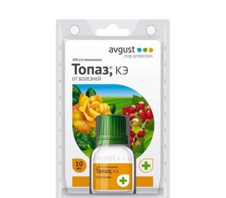 Operating principle. One-component agent, the active substance is penconazole. Getting on mycelium, penconazole completely stops the vital activity of the fungus - its spores no longer grow. After some time, the spores die inside the plant. The best effect from Topaz is noted in the early stages of the disease - it is able to suppress primary infection in a short time. It copes well with diseases such as oidium, rust, mildew.
