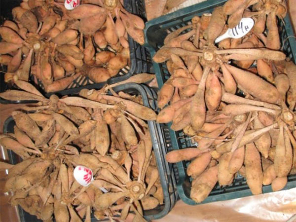 In order for tubers to be ready for planting, they must be properly stored in the winter. When the first frosts occur, you need to dig up the tubers you like. Stalks and roots slightly trimmed.