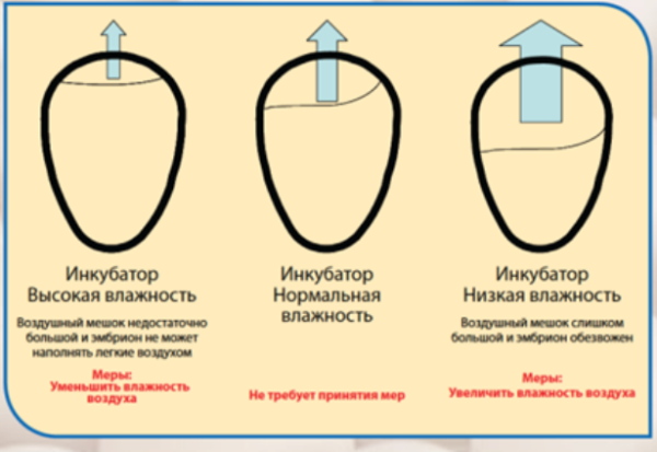 Another important parameter for a successful brood. It is possible to avoid air drying in the incubator by evaporating water from a special reservoir at the bottom of the device. It is necessary to monitor this mode as well as the temperature. Optimum humidity indices are 50-80%, maximum permissible ones are 45% and 85%.