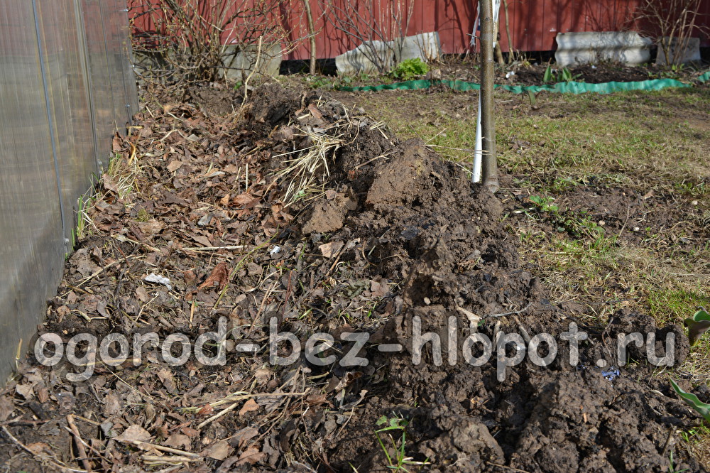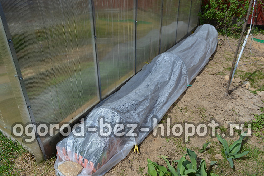 After all the layers are laid, the resulting thermos should be abundantly moistened with a warm solution of mullein. It is this ingredient in combination with the sun's rays that will start the process of heat generation from organic matter. To speed up heating, the area can be covered with a film for several days.