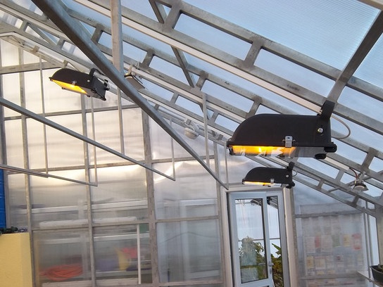 The greenhouse is heated by an infrared heater using electric, gas or diesel installations that emit infrared rays. Heating elements in them are of the following types: ceramic, carbon or heating elements. They also differ in shape. These are lamps, tapes and panels that heat the surface of the soil.