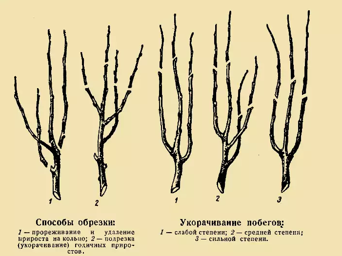 Slices are performed at an angle of 45 °. At the same time, they recede by 2 cm from the distant kidney. Annual shoots are cut into 2 buds. The shoot bearing fruit this season (2 year old) is cut out. Five-year fruit links are removed.