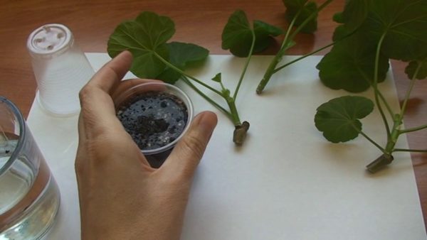 This method of grafting pelargonium is the simplest. For root growth, the cuttings are dipped in containers with clean water, deepening the lower end by 2-3 cm, so as not to reduce the useful area for respiration of the process. For disinfection, powder from crushed tablets of activated carbon is added to the cups. This will prevent the stalk from decaying.