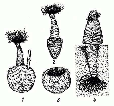 - A month before landing on the site, the stalk is cut off on the cone so that in the lower part a diameter of 15-20 cm is obtained. Rotten leaves and small roots are removed. Prepared plants are placed in a bright place where the air temperature is not lower than + 7 ° C. They are stacked in a stack. Sprinkle the roots with wet peat or rotted manure, then cover with plastic wrap.