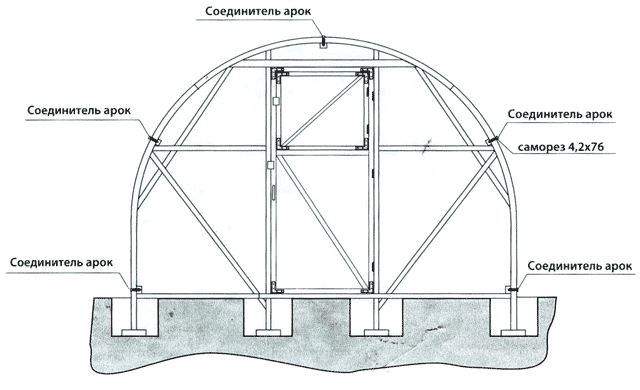 To increase the life of the polycarbonate greenhouse and plastic pipes, it is recommended to make a concrete foundation in advance. The design itself and its installation will not change from this, but the fittings will not be driven into the ground, but walled up in concrete, which will allow the wooden elements of the frame to last longer.