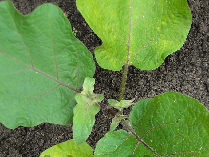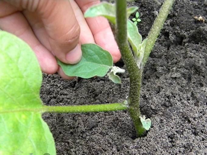 Stepson is an extra branch growing from the base of an existing leaf of an eggplant bush. It is very easy to notice, because it really looks “out of place”, as in this photo: