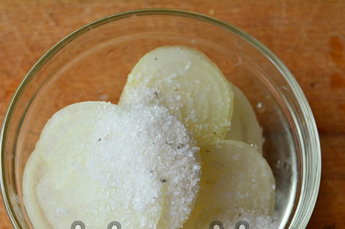 To chop the onion “without tears,” I recommend periodically soaking the knife under running water. The second effective way is to put onions in the freezer for literally 7 minutes.