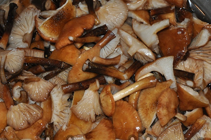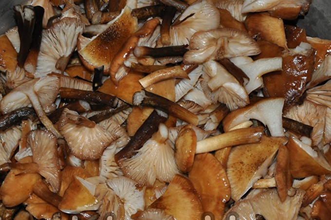 Then honey mushrooms need to be washed thoroughly, paying special attention to the plates under the hat (it is in these inaccessible places that dirt often accumulates), put into a pan (it is advisable to cut large mushrooms into several parts, and leave small ones whole).