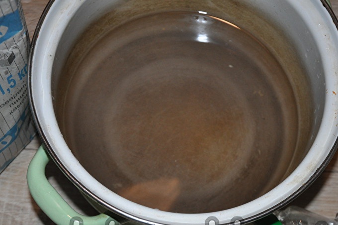 In a separate pan (the pan can be taken smaller, since mushrooms are significantly reduced in volume during cooking) you need to prepare the marinade: pour 1 liter of water, add 1.5 tbsp. l salt and 4 tbsp. l 9% vinegar, mix well.