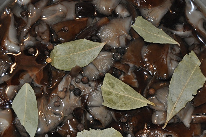 In the cooked marinade, pour the boiled water a second time, filtered and washed under the water mushrooms, add bay leaves, peas of allspice and black pepper, and put to boil (cooking time - 10 minutes from the moment of boiling).