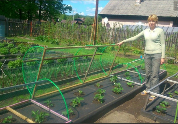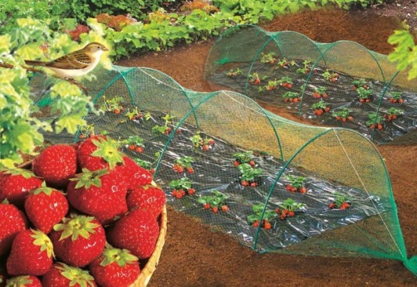 Low-growing berries can be covered with a net on short pegs. But at the same time sagging will be observed. Use high arcs to eliminate this error. The frame is made of steel or bamboo arcs. They are placed in increments of 70 centimeters. The material itself is placed at a height of 30 cm. It is better to press such a construction with something heavy on the sides. Boxes are made of boards, selecting sizes in accordance with the beds.