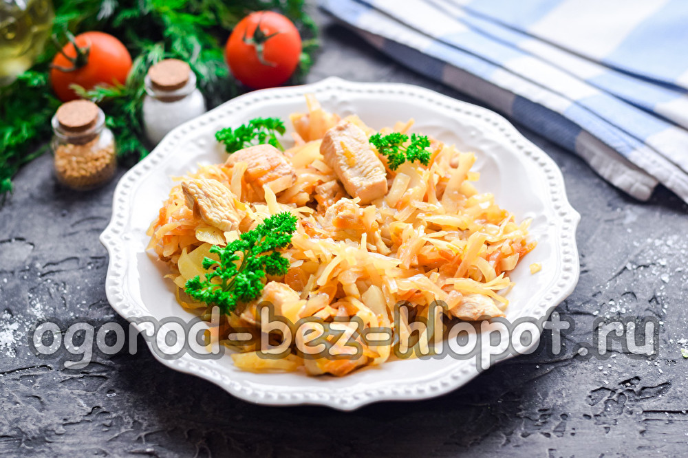 Stewed chicken can be taken from any part of the chicken, but the best option would be the fillet, without bones and skin. We’ll also add carrots and onions to the dish, you can add a little tomato or ketchup if desired. You can stew cabbage in a pan or in a pan.
