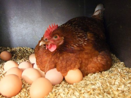 A chicken gives 320 brown eggs per year. Egg production starts from 135 days of life. The mass of large eggs reaches 63 g.
