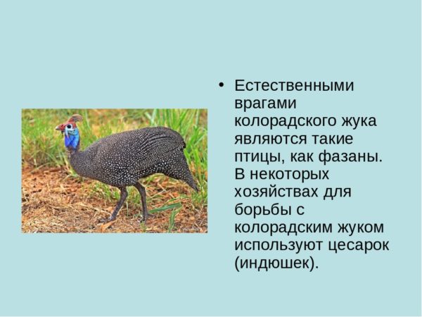These birds also eat the larvae of the Colorado potato beetle, but require special care. They can be exposed to various diseases. Therefore, when growing them, care and attention is required more.