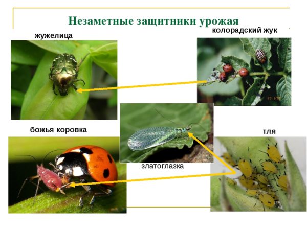 To date, his natural enemies can help in the fight against Colorado beetles. The insects that eat this beetle include: ladybug, lacewing, syphrids.