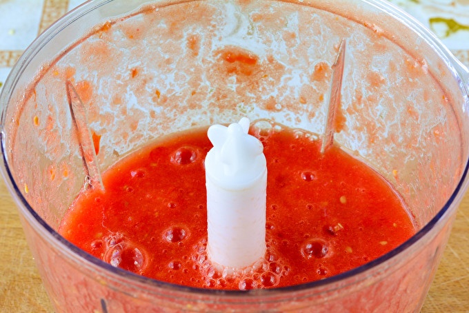 Grind tomatoes in a blender or in a meat grinder, we get tomato sauce for salad.