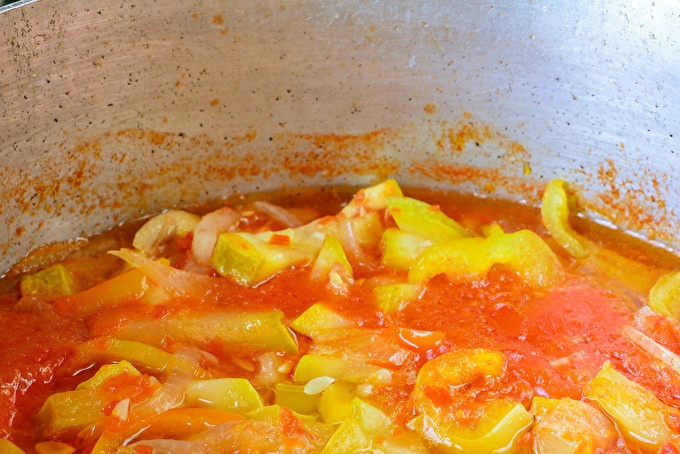 Pour the marinade in a saucepan, warm it over medium heat and start laying vegetables: zucchini will go first, stew them for 5-7 minutes, stirring occasionally, so that they do not stick to the bottom.