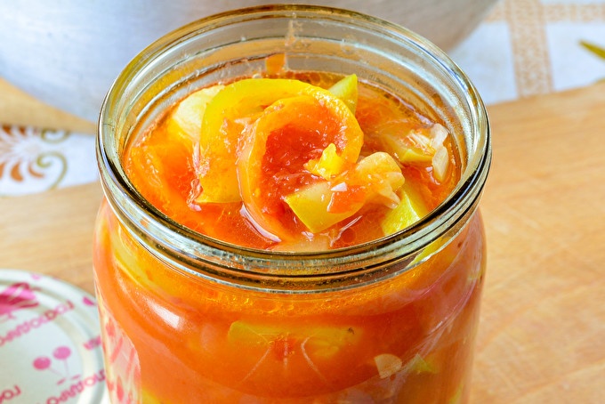 Today we offer you to prepare for the winter the most delicious salad with the unique name “Ankl Bens” of zucchini with tomatoes. According to the recipe from the photo you can easily close a couple of jars. In addition to zucchini and tomato, it consists of onions and peppers.