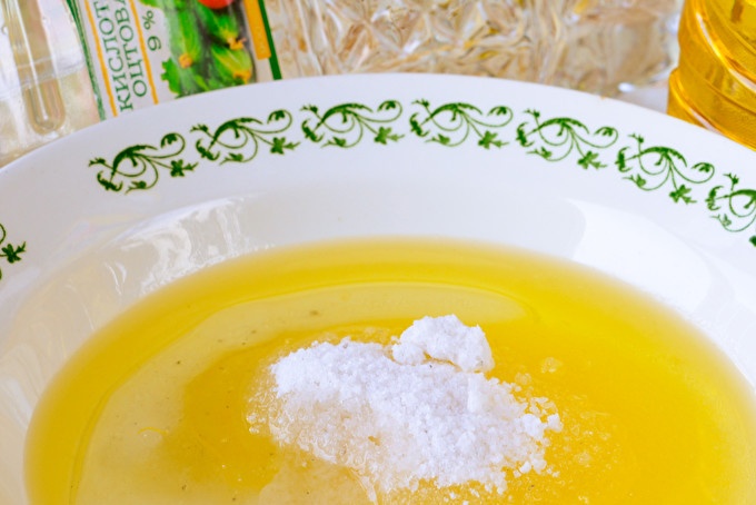 For the marinade, mix the vegetable oil, vinegar and add a mixture of salt and sugar. Mix the marinade, it is ready.