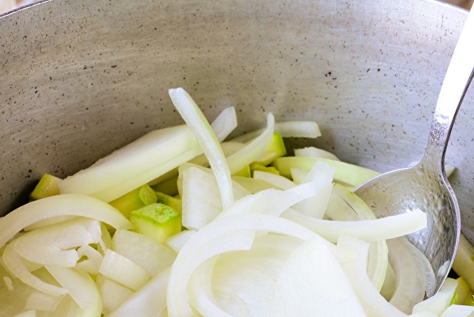 Add onions to squash and continue to stew all together, stirring occasionally. Quenching will take about 5 minutes again.