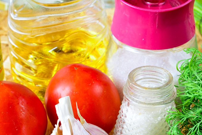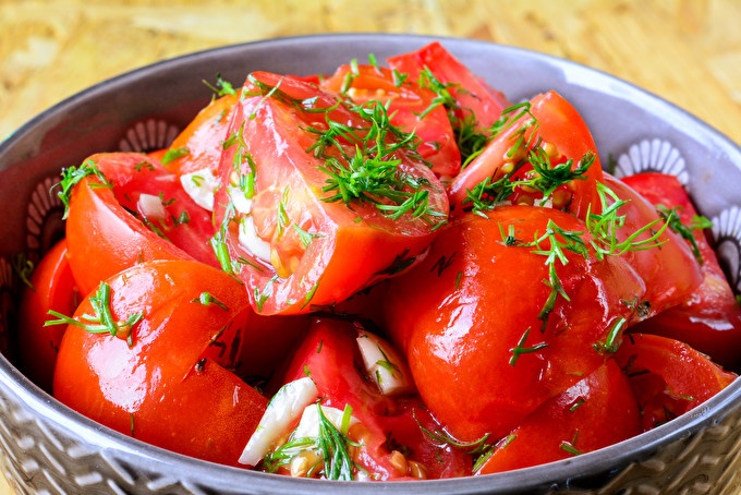 To the tomatoes add finely chopped greens: dill is the best way to give the tomatoes a fresh flavor.