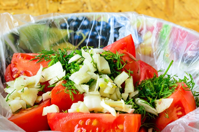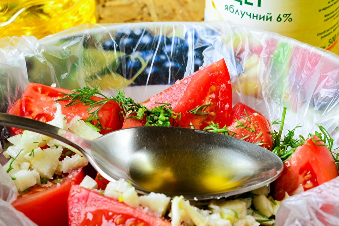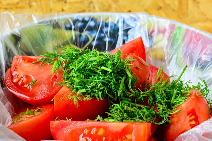 For marinating, we also need the usual cellophane bag, for reliability, you can take 2 pieces at once. Why we take the package: it will be convenient to mix in it and the marinade will not go anywhere, will cover all the tomatoes. If you wish, use a container with a tight lid, but in the package it is still more convenient and then you do not need to wash the dishes, also a bonus.
