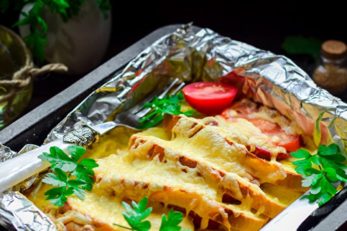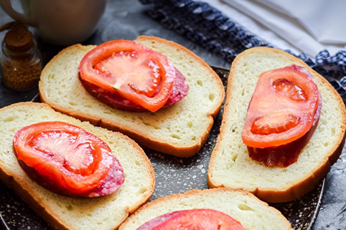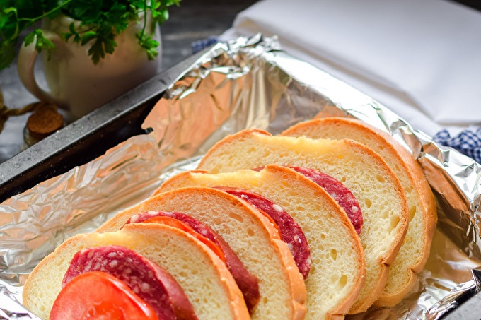 We take the sliced loaf as a basis, add tasty sausage, tomatoes, hard cheese. The recipe for making sandwiches is simple, we will bake in the oven.