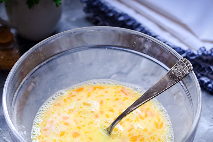 In a bowl, shake chicken eggs and milk, add salt, ground pepper.