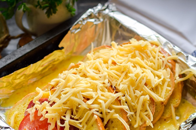 Cover the form with foil or baking paper. Put in the form of prepared slices of loaf with sausage and tomatoes.