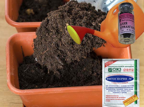 - dressing Substrate from a dacha or excavated soil from a forest belt should be poured abundantly with an aqueous solution with the addition of potassium permanganate. Achieve pink fluid staining. Use the component after the complete drying of the soil mixture.