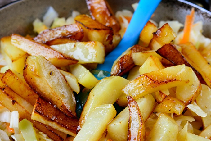In vegetable oil, quickly fry the potatoes until golden crust. The main thing to grab, and then dogotovit it along with the cabbage. A beautiful ruddy crust will give the dish an extra rich flavor, because in the process of stewing this color will not appear.