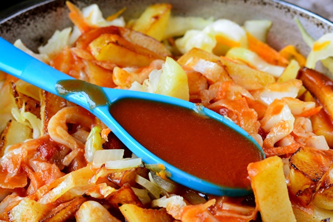 Tomato sauce pour the cabbage with potatoes and simmer under the lid for 15-20 minutes.