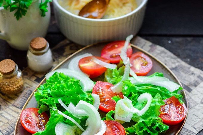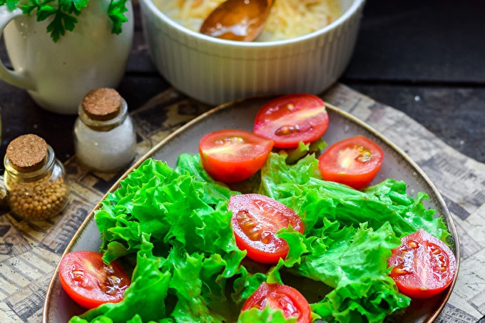 Cooking a light salad with a cheese-mustard dressing: the recipe is simple and very tasty, and most importantly - quick. To repeat this step-by-step recipe with a photo, we need fresh lettuce leaves, add also some cherry tomatoes, fresh cucumbers, onions. For salad dressing we will use a mixture of mustard beans, lemon juice and oil. Also add cheese chips to the dressing.