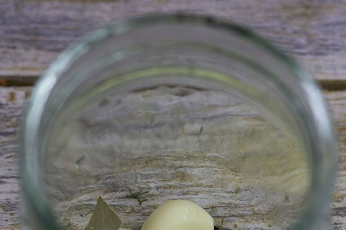 Wash it thoroughly with soda solution, sterilize the jar, dry it with moisture. Put halves of garlic cloves, bay leaf, black pepper and sweet peas on the bottom. Cucumbers will become more fragrant if, in addition, in the jar you put leaves of oak, black / red currant, a piece of ginger root or horseradish.